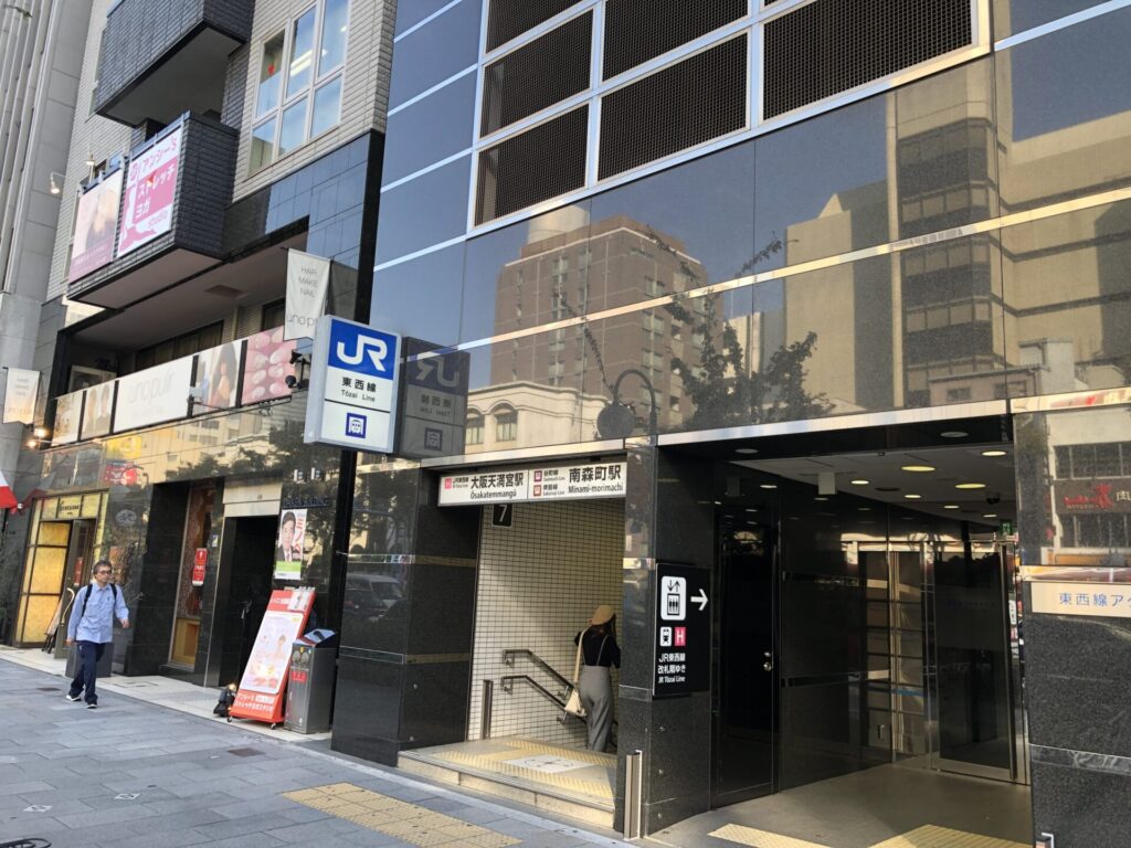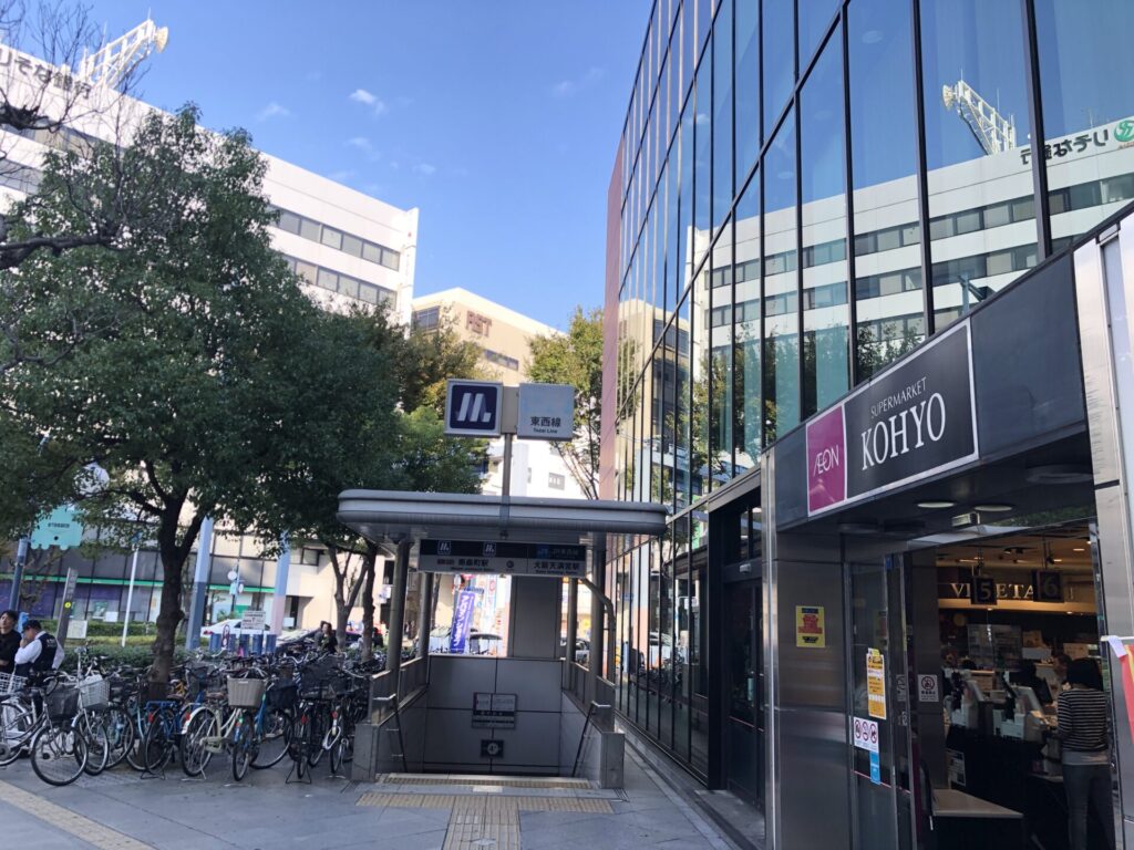 まず、地下鉄南森町駅、JR大阪天満宮駅の地下から、4番出口を上がってください。スーパーマーケット「KOHYO」(コーヨー)の前に出ます。