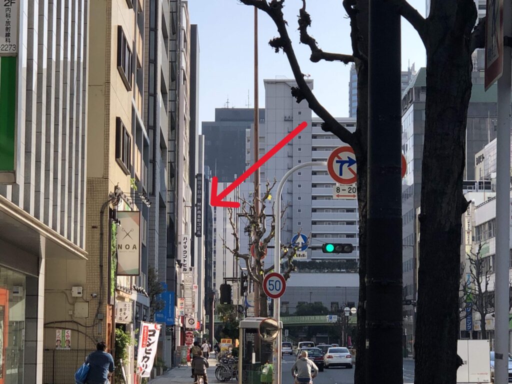 まっすぐ歩くと、小さく「南森町3ビル」の立て看板が見えてきます。